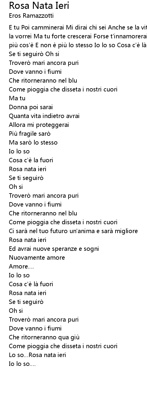 | E tu Poi camminerai Mi dirai chi sei Anche se la vita qui Non è più così Come la vorrei Ma tu forte crescerai Forse t' innamorerai Anche se l' amore qui Non so più cos'è E non è più lo stesso Io lo so Cosa c'è là fuori Rosa nata ieri Se ti seguirò Oh si | |
