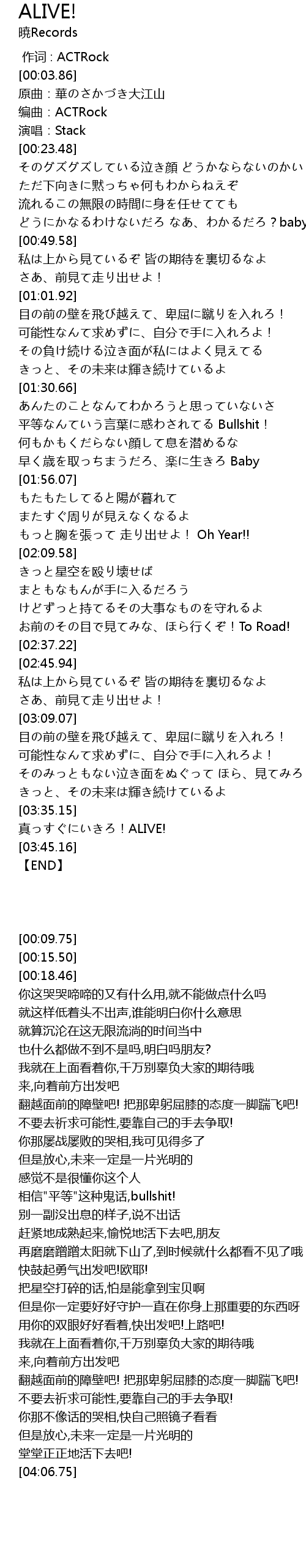 | [03:36.44] | 真っすぐにいきろ!ALIVE! |