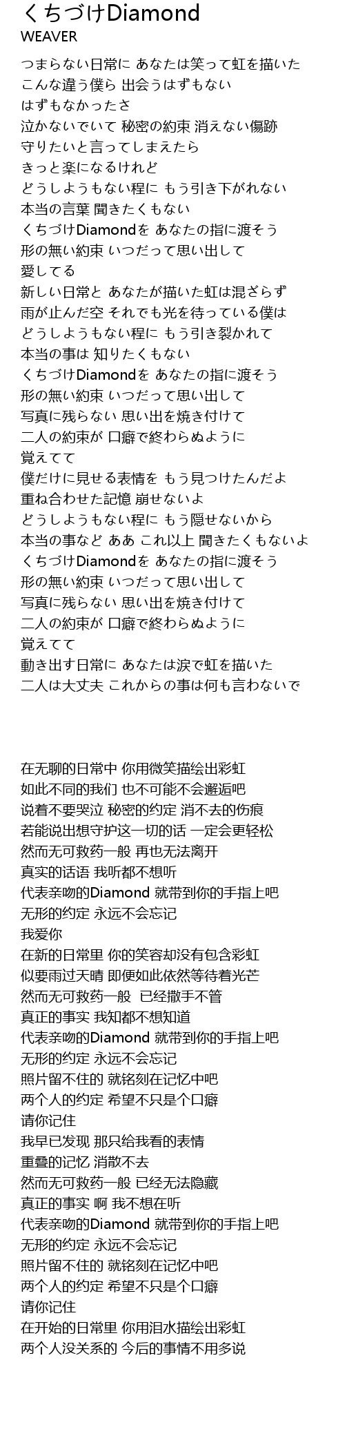 | [01:51.000] | くちづけDiamondを あなたの指に渡そう |
