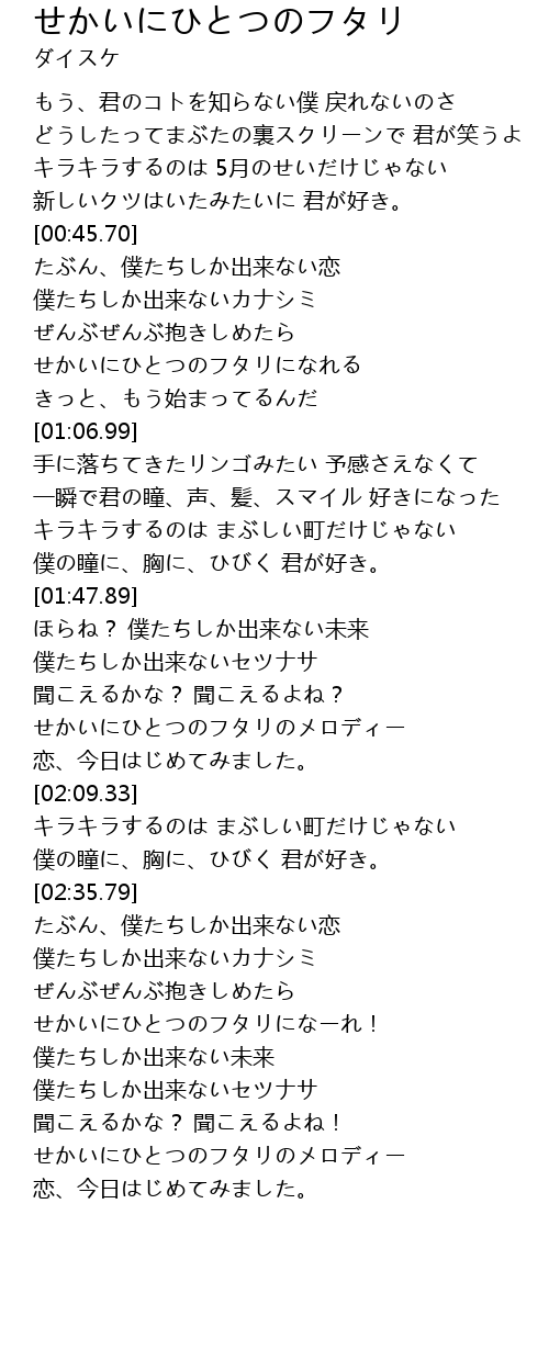| [01:59.69] | せかいにひとつのフタリのメロディー |