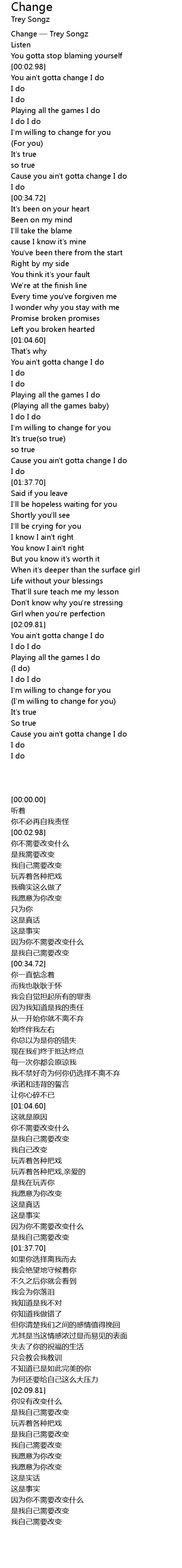 | [01:30.06] | Cause you ain' t gotta change I do |