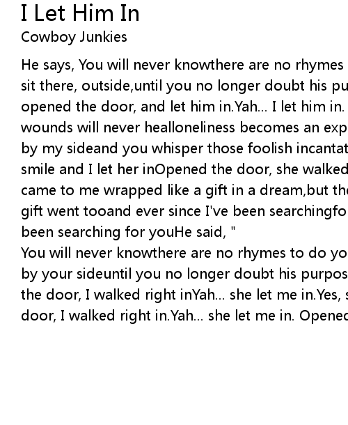 He says, You will never knowthere are no rhymes to do you justice."And he will sit there, outside,until you no longer doubt his purpose.So, I let him in.I opened the door, and let him in.Yah... I let him in. Opened my heart...Some wounds will never healloneliness becomes an expectation.But you stretched there by my sideand you whisper those foolish incantations.So, I let her ina crooked smile and I let her inOpened the door, she walked right inI opened my heart...It came to me wrapped like a gift in a dream,but then the dream disappearedand the gift went tooand ever since I've been searchingfor me and youever since I've been searching for youHe said, " |
