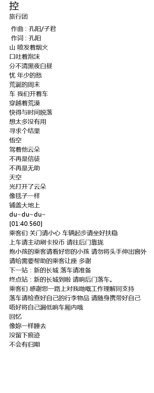 | [01:41.120] | 乘客们 关门请小心 车辆起步请坐好扶稳 |
