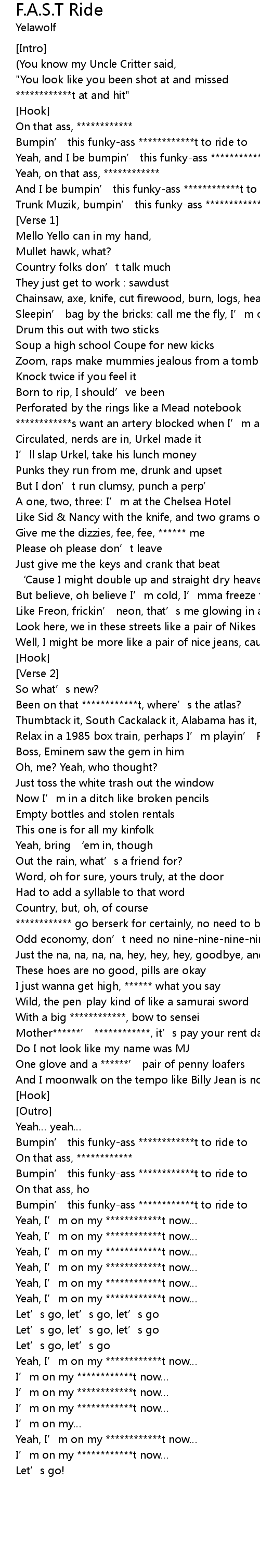 | Yeah, and I be bumpin’ this funky-ass ************t to ride to | |
