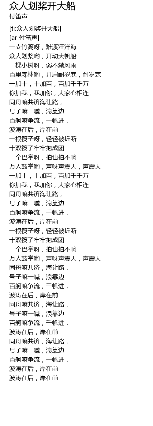 | [00:38.225] | 众人划桨哟,开动大帆船 |