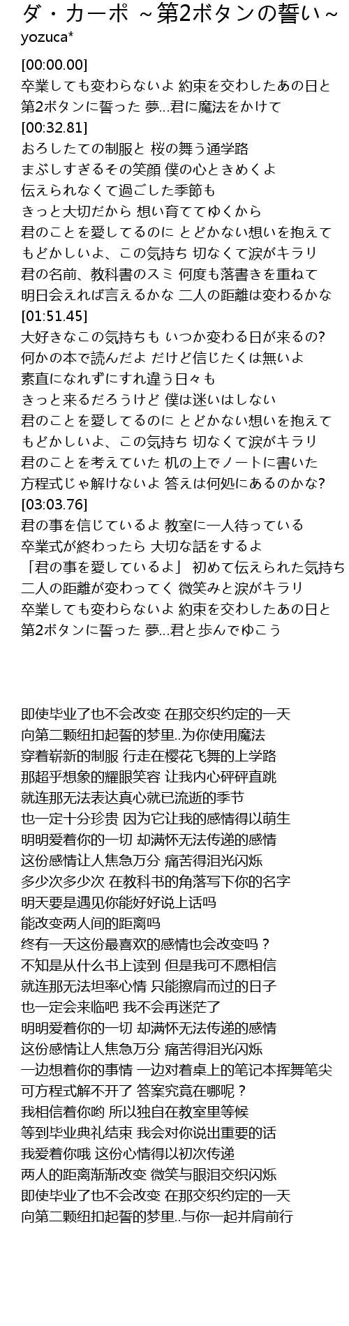 | [03:58.50] | 第2ボタンに誓った 夢…君と歩んでゆこう |