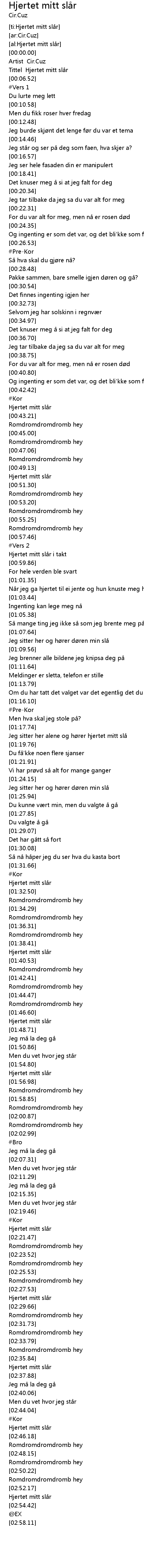 | [02:53.84] | Hjertet mitt slår |