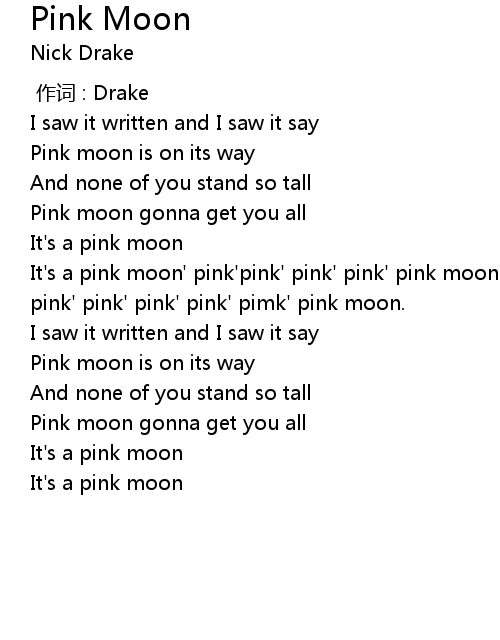 | [00:39.93] | It's a pink moon' pink'pink' pink' pink' pink moon. |