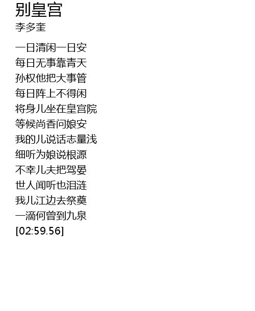 | [01:39.60] | 将身儿坐在皇宫院 |