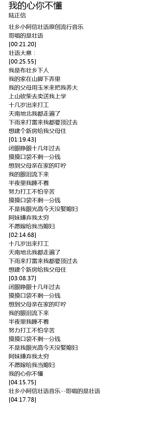 | [04:16.87] | 壮乡小阿信壮语音乐--哥唱的是壮语 |