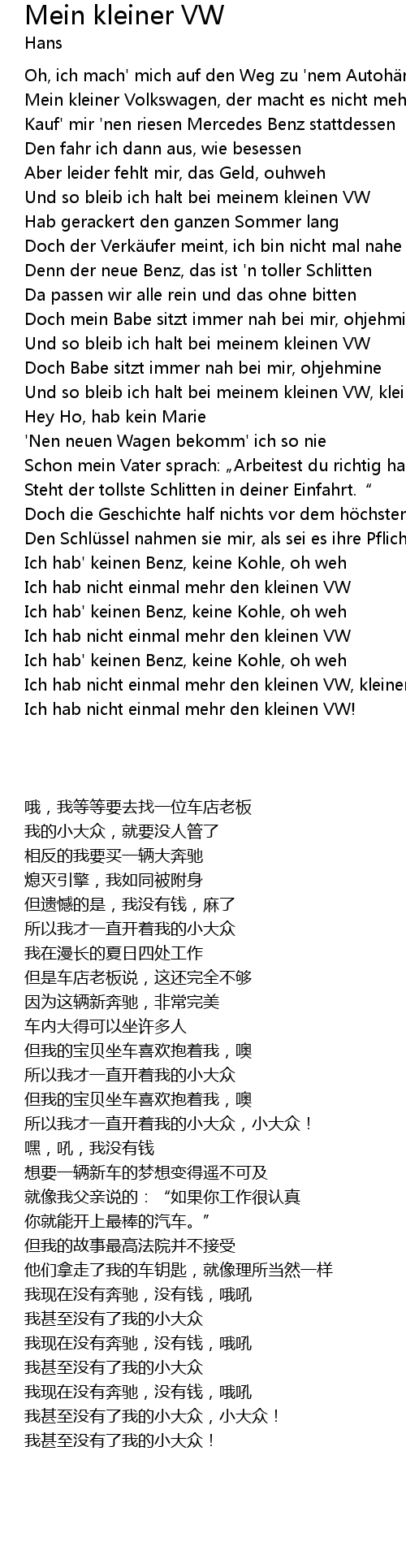 | [00:27.95] | Und so bleib ich halt bei meinem kleinen VW |