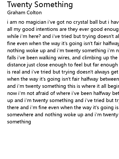 i am no magician i've got no crystal ball but i have made a few things disappear all my good intentions are they ever good enough? am i only running circles while i'm here? and i've tried but trying doesn't always get me there and i'm fine even when the way it's going isn't fair halfway between somewhere and nothing woke up and i'm twenty something i'm no acrobat but i've had my share of falls i've been walking wires, and climbing up the walls and i have kept my distance just close enough to feel but far enough away to know that what i know is real and i've tried but trying doesn't always get me there and i'm fine even when the way it's going isn't fair halfway between somewhere and nothing woke up and i'm twenty something this is where it all begins i'm giving up on giving in now i'm not afraid of where i've been halfway between somewhere and nothing woke up and i'm twenty something and i've tried but trying doesn't always get me there and i'm fine even when the way it's going isn't fair halfway between somewhere and nothing woke up and i'm twenty something woke up and i'm twenty something |