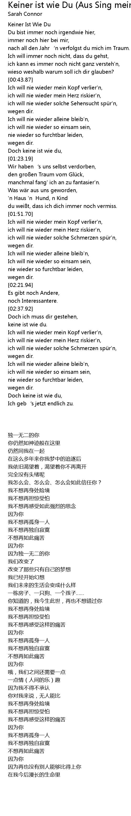 | [00:51.64] | ich will nie wieder solche Sehensucht spür'n, |