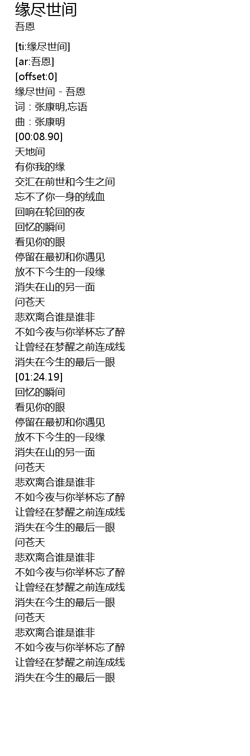 | [00:01.07] | 缘尽世间 - 吾恩 |
