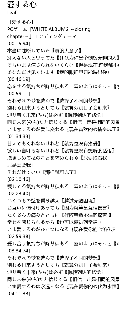| [00:04.08] | PCゲーム『WHITE ALBUM2 ~closing chapter~』エンディングテーマ |