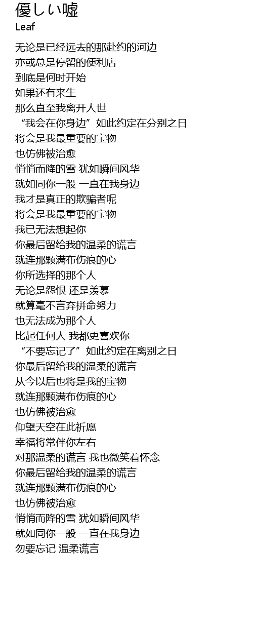 | [03:56.07] | 对那温柔的谎言 我也微笑着怀念 |