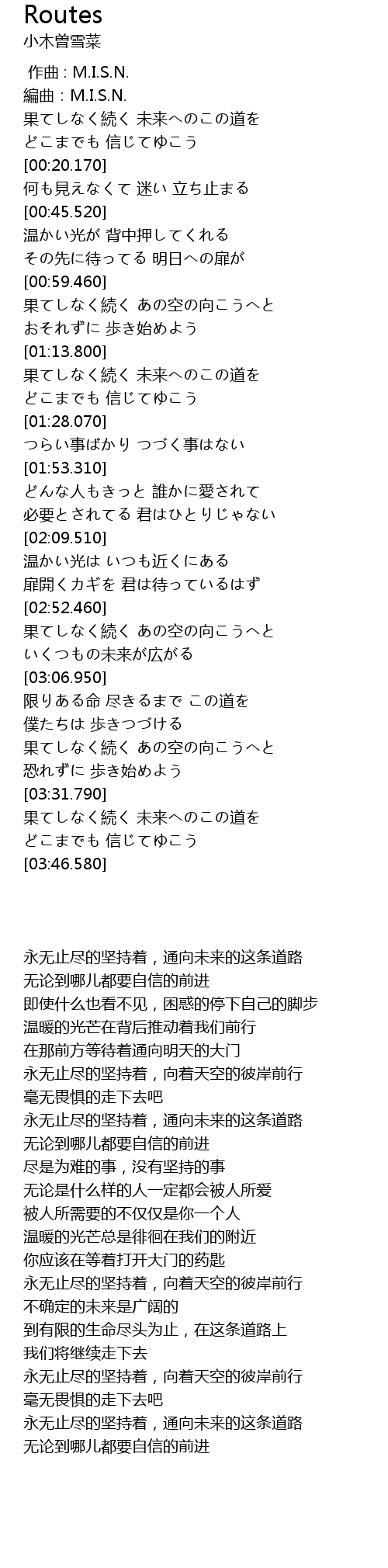 | [03:32.190] | 果てしなく続く 未来へのこの道を |