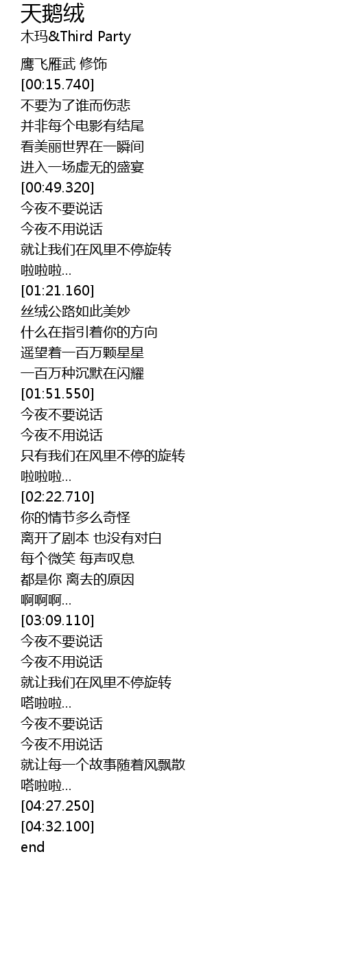 | [03:39.630] | jīn yè bú yào shuō huà |
