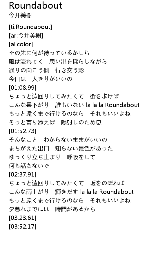 | [01:20.77] | こんな昼下がり 誰もいない la la la Roundabout |