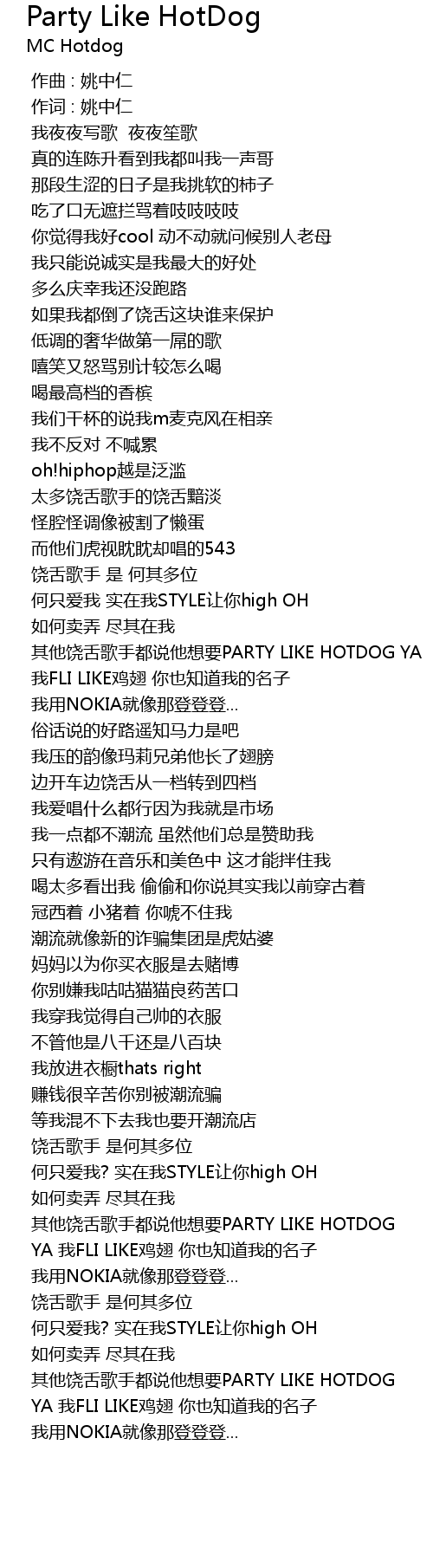| [01:58.358] | 其他饶舌歌手都说他想要PARTY LIKE HOTDOG |