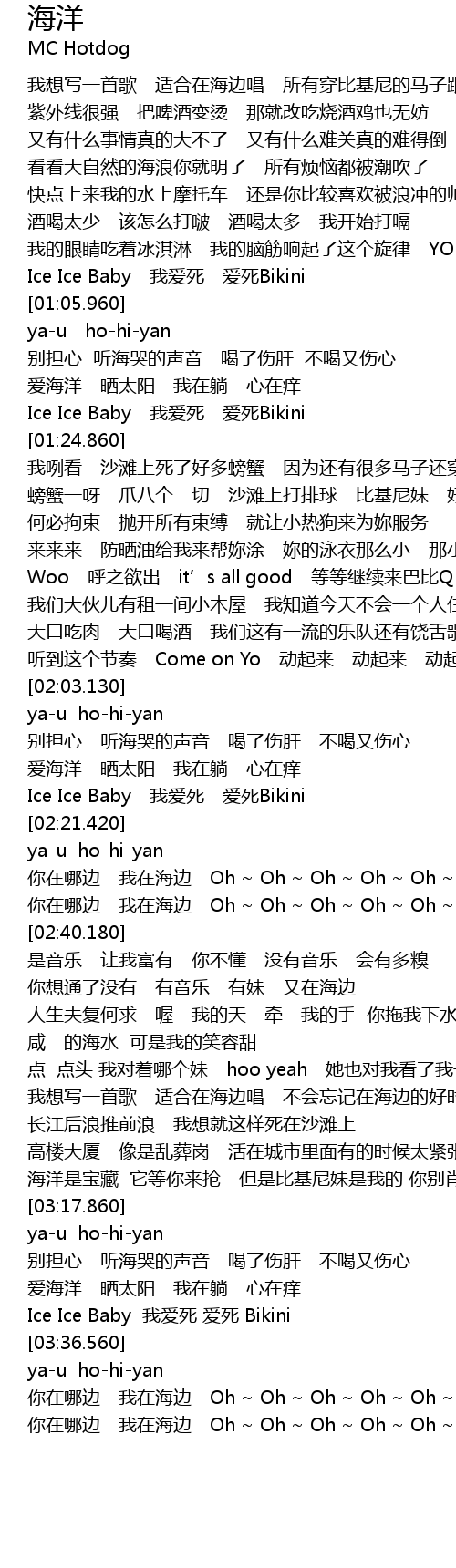 | [02:17.190] | Ice Ice Baby wo ai si ai si Bikini |
