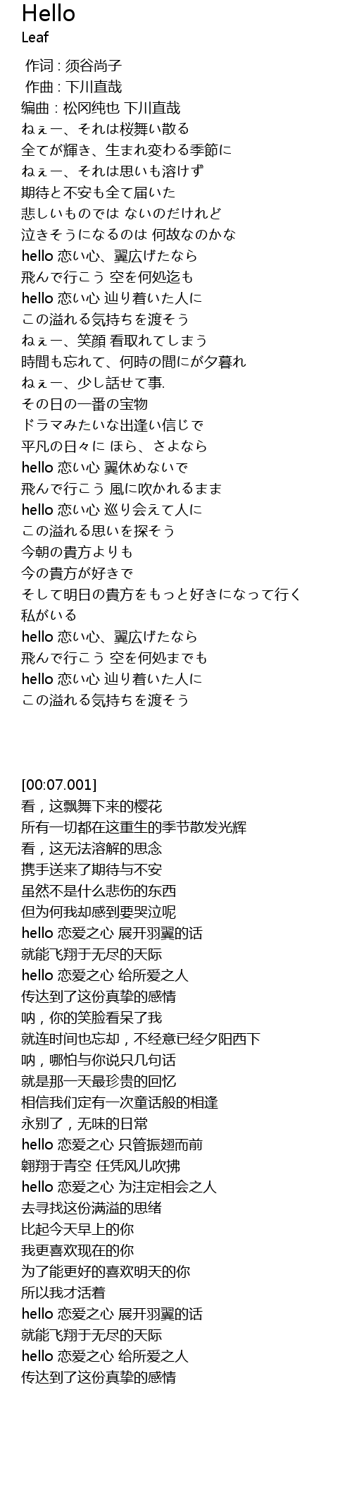 | [01:14.401] | hello 恋い心 辿り着いた人に |