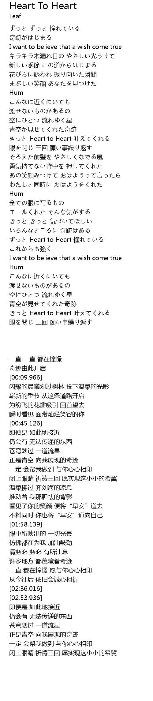 | [03:21.469] | きっと Heart to Heart 叶えてくれる |