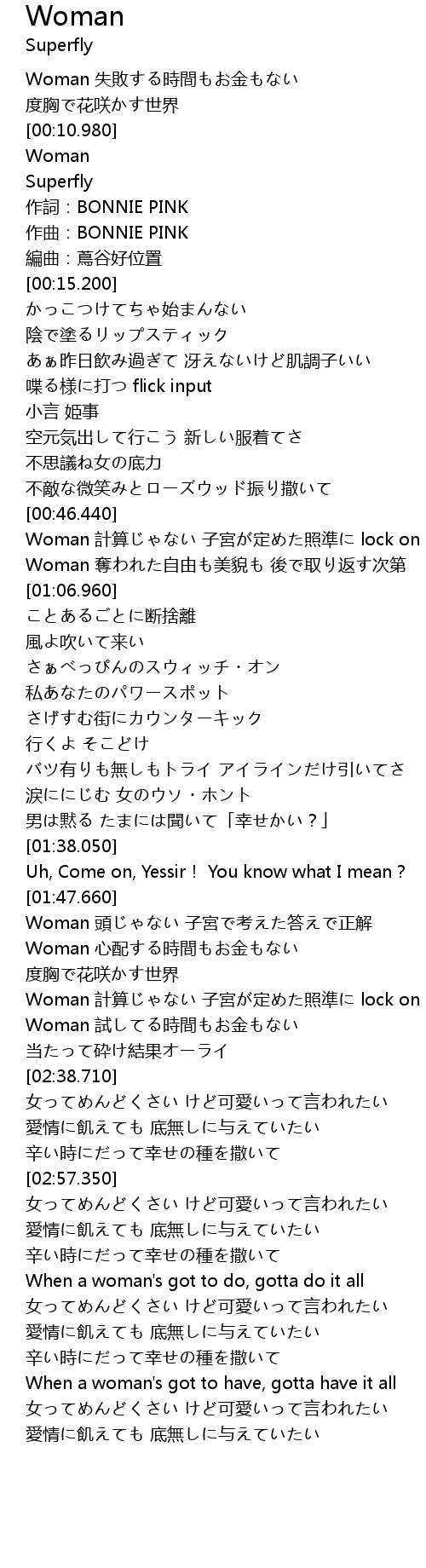 | [00:46.940] | Woman 計算じゃない 子宮が定めた照準に lock on |