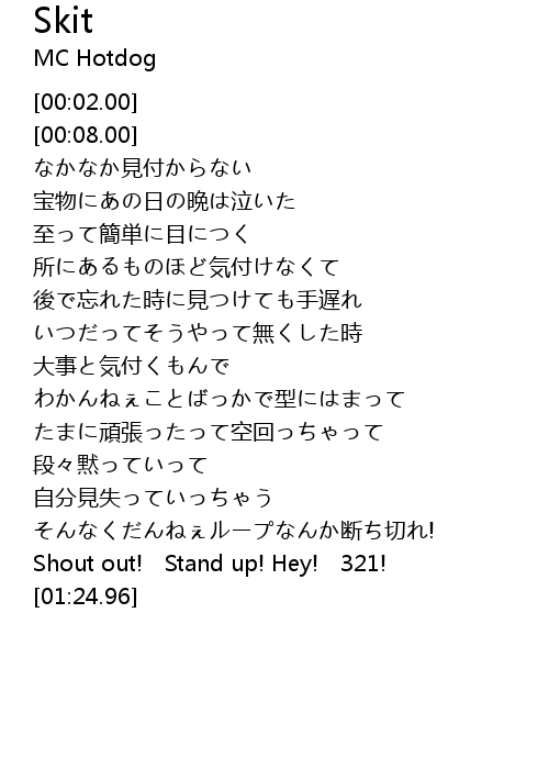| [01:00.55] | Shout out! Stand up! Hey! 321! |