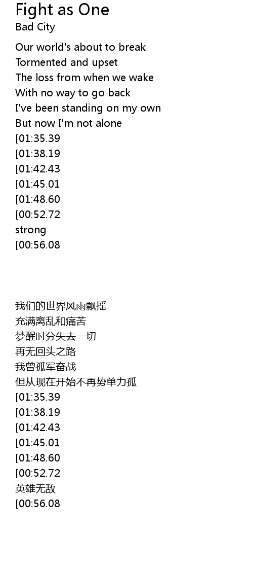 | [00:49.24][00:56.08][01:54.91][02:01.22][02:07.76][02:14.45] | Forever fight as one |