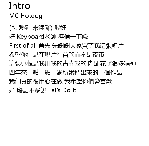 | First of all 首先 先謝謝大家買了我這張唱片 希望你們是在唱片行買的而不是夜市 | |
