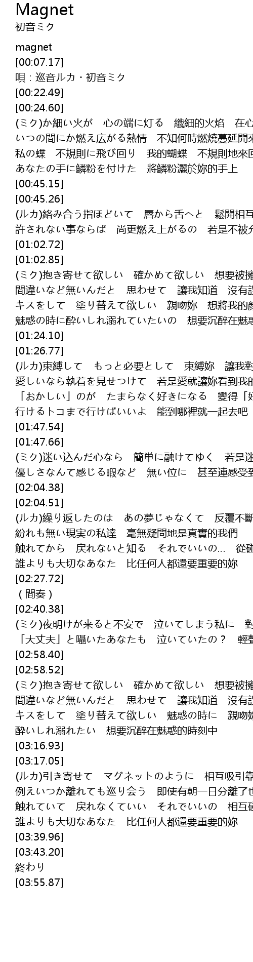 | [03:17.20] | (ルカ)引き寄せて マグネットのように 相互吸引靠近 宛如磁石一般 |