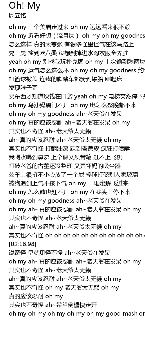 | [02:22.73] | oh my ah~真的应该忍耐 ah~老天爷在发呆 oh my |