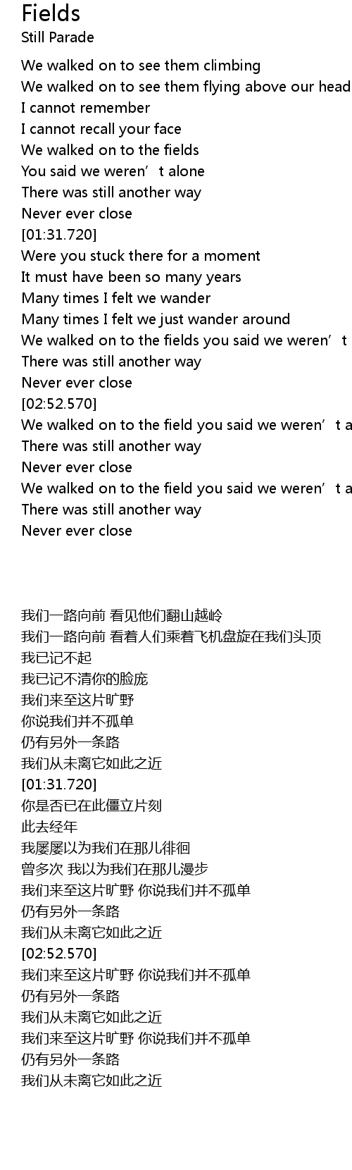 | [03:19.810] | We walked on to the field you said we weren' t alone |