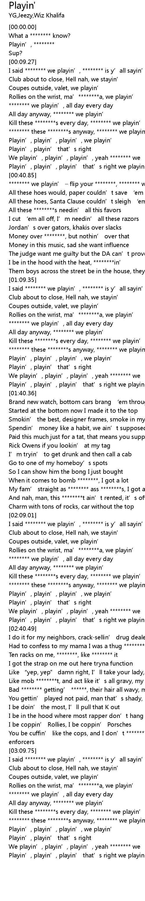 | [03:10.40] | I said ******** we playin’, ******** is y’all sayin’? |