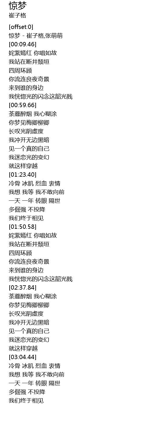 | [00:01.96] | 惊梦 - 崔子格,张萌萌 |