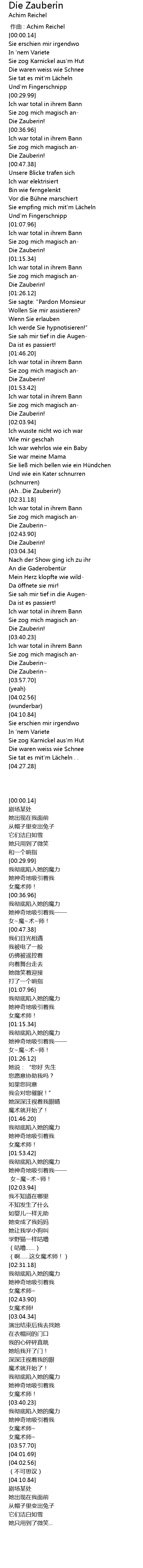 | [00:21.04] | Sie zog Karnickel aus'm Hut |