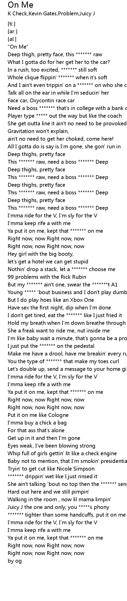 | [01:08.14] | Ya put it on me, kept that ******* on me |
