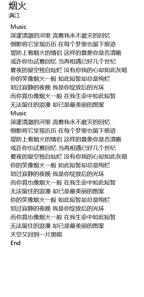 | [01:29.500] | 而你竟也像烟火一般 在我生命中如此短暂 |