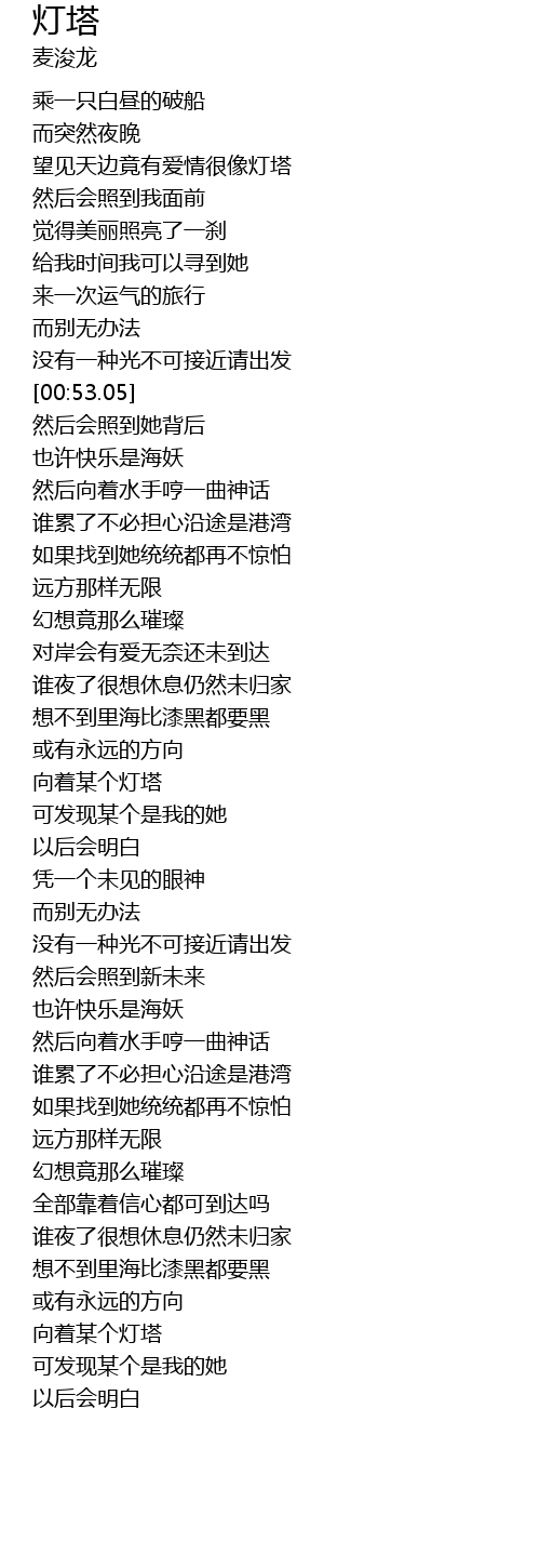 | [00:19.68] | 望见天边竟有爱情很像灯塔 |