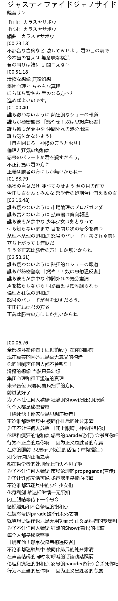 | [03:17.08] | 倫理と狂気の飽和点 怒号のパレードが君を殺すだろう。 |