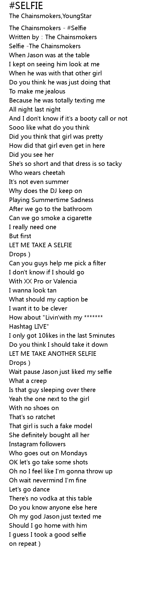 | [00:00.931] | Selfie The Chainsmokers |