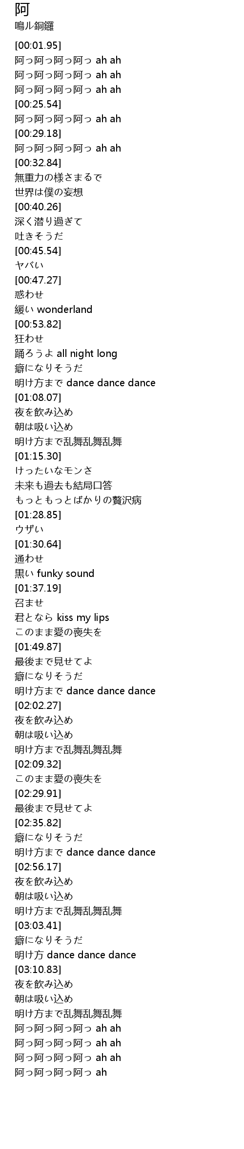 | [00:15.40] | 阿っ阿っ阿っ阿っ ah ah |