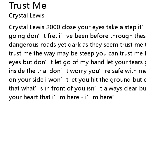 | Crystal Lewis 2000 close your eyes take a step it' s ok i know where we' re going don' t fret i' ve been before through these valleys down these long and dangerous roads yet dark as they seem trust me though you can' t see you can trust me the way may be steep you can trust me let me lead... trust me open your eyes but don' t let go of my hand let your tears give way to smiles see the joy inside the trial don' t worry you' re safe with me around rest assured i' m on your side i won' t let you hit the ground but close as it seems.. see i know that what' s in front of you isn' t always clear but you must believe it in your heart that i' m here i' m here! |