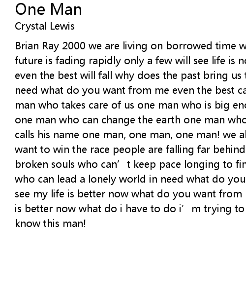 | Brian Ray 2000 we are living on borrowed time we all have hopes and dreams our future is fading rapidly only a few will see life is not always what it seems even the best will fall why does the past bring us to see we are in such great need what do you want from me even the best can see my life is better now one man who takes care of us one man who is big enough one man who sees every hurt one man who can change the earth one man who takes all the pain of everyone who calls his name one man, one man, one man! we all want more than what we need we want to win the race people are falling far behind aren' t we the chosen kind broken souls who can' t keep pace longing to find their way looking for someone who can lead a lonely world in need what do you want from me even the best can see my life is better now what do you want from me even the best can see my life is better now what do i have to do i' m trying to reach for you i want you to know this man! |