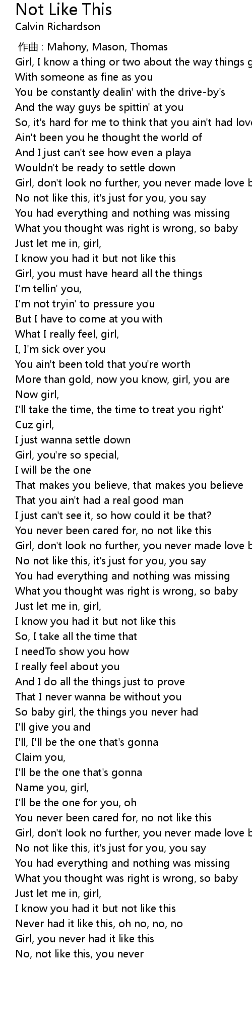| [00:51.19] | Girl, don't look no further, you never made love before |