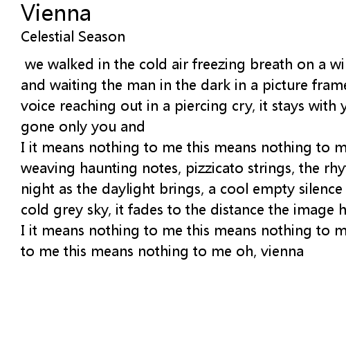 I it means nothing to me this means nothing to me oh, vienna the music is weaving haunting notes, pizzicato strings, the rhythm is calling alone in the night as the daylight brings, a cool empty silence the warmth of your hand and a cold grey sky, it fades to the distance the image has gone only you and |