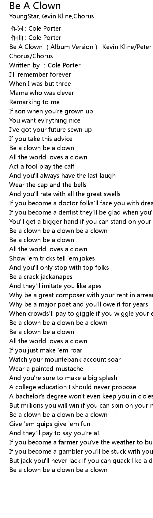 | [00:00.00] | Be A Clown Album Version Kevin Kline Peter Polycarpou and Chorus Chorus |