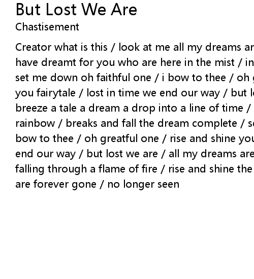 Creator what is this / look at me all my dreams are ceased / hopeful dreams i have dreamt for you who are here in the mist / in my eyes it is pure divinity / set me down oh faithful one / i bow to thee / oh greatful one / rise and shine you fairytale / lost in time we end our way / but lost we are / our life is a breeze a tale a dream a drop into a line of time / a minute shivers from the rainbow / breaks and fall the dream complete / set me down oh faithful one / i bow to thee / oh greatful one / rise and shine you fairytale / lost in time we end our way / but lost we are / all my dreams are lost are gone are dead / are falling through a flame of fire / rise and shine the tale survived / but lost we are forever gone / no longer seen