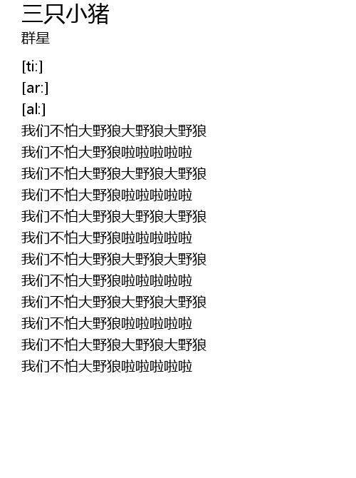 | [00:05.58] | 我们不怕大野狼大野狼大野狼 |